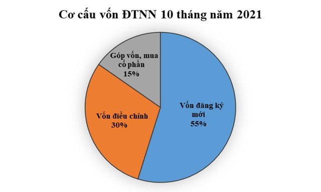 Trong khi đó, do ảnh hưởng của dịch bệnh Covid-10, phần đầu tư thông qua góp vốn, mua cổ phần tiếp tục xu hướng giảm. 10 tháng, có 3.063 lượt góp vốn, mua cổ phần của nhà đầu tư nước ngoài, giảm 43,8%, với tổng giá trị vốn góp là 3,63 tỷ USD, giảm 40,6%.