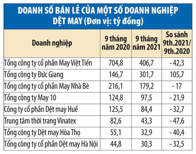 Đơn cử, với Tập đoàn Dệt may Việt Nam (Vinatex), doanh thu bán lẻ trong 9 tháng của năm 2021 đạt 24,6 ngàn tỷ đồng, giảm 12,4% so với cùng kỳ năm 2020.