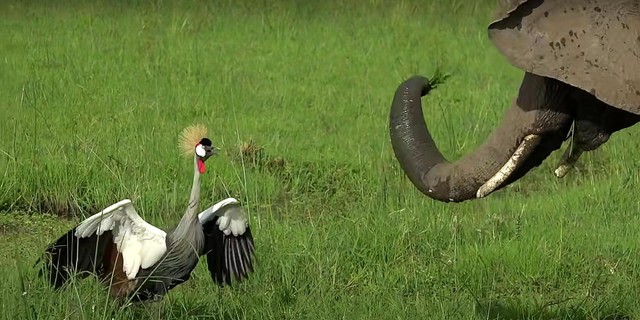 Bất ngờ, trong khi con sếu vương miện xám đang chăm bẵm cho những quả trứng của mình thì một đàn voi khổng lồ đi ngang qua và thản nhiên đến khu vực lãnh địa của con chim để gặm cỏ.