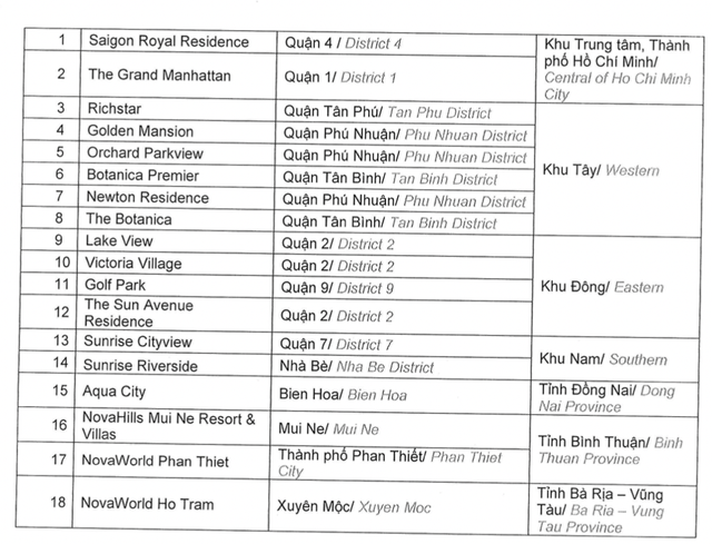 Cho năm 2021, Novaland tiếp tục kinh doanh và phát triển nhưng không giới hạn các dự án dưới đây: