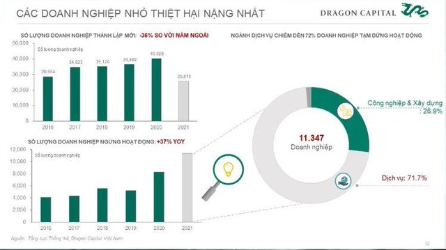 Năm 2020, dựa trên số liệu thống kê từ 600 doanh nghiệp, Dragon cho biết, khi Việt Nam có chiến lược zero covid, thì ngành sản xuất mất tầm 3 quý để phục hồi lại như trước giãn cách, còn ngành dịch vụ thì 4 quý cũng không quay lại mức trước giãn cách được, vì mỗi khi covid xảy ra ở một địa phương, thì ngành dịch vụ lại phải tạm ngưng, trong khi ngành sản xuất vẫn diễn tiến.