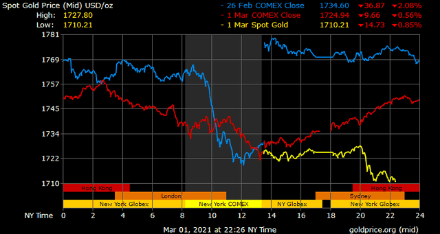 Trên thị trường vàng thế giới, giá vàng giao ngay chốt phiên đêm qua tại Mỹ giảm 10,8 USD xuống 1.724,8 USD/ounce. Sang phiên châu Á sáng nay, giá vàng tiếp tục giảm và về gần 1.710 USD/ounce.