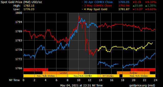 Giá vàng tương lai giao tháng 6 trên sàn Comex New York tăng 4,7 USD lên 1.780,7 USD/ounce.