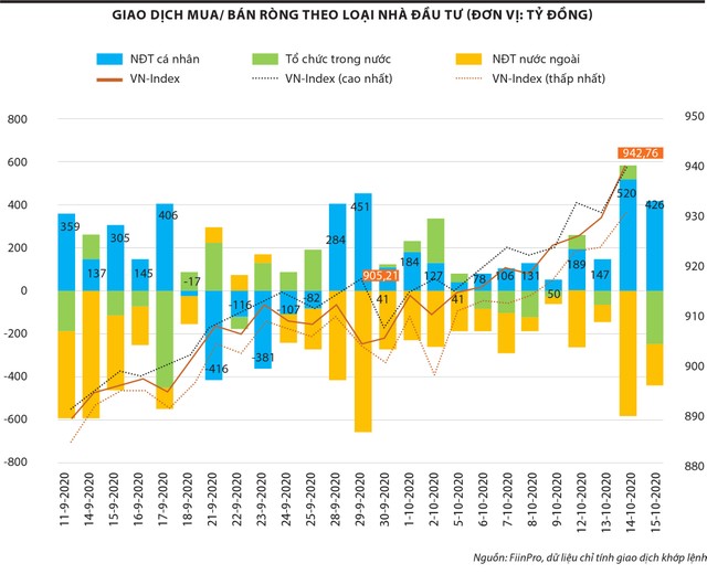 Theo số liệu thống kê từ Fiintrade, nhà đầu tư cá nhân trong nước liên tiếp mua ròng từ đầu tháng 10 đến nay, đặc biệt là phiên thanh khoản kỷ lục ngày 14/10, dòng tiền nội mua ròng mạnh.