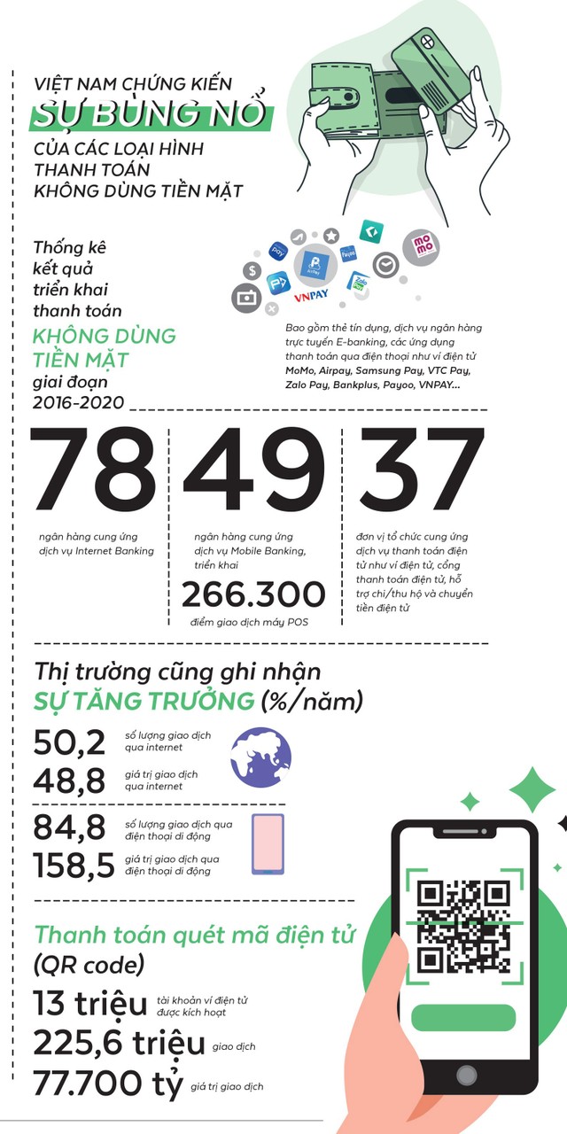 Thống kê kết quả triển khai thanh toán không dùng tiền mặt giai đoạn 2016-2020 cho thấy, có 78 ngân hàng cung ứng dịch vụ Internet Banking, 49 ngân hàng cung ứng Mobile Banking, triển khai 266.300 điểm giao dịch POS và 37 đơn vị cung ứng dịch vụ thanh toán điện tử như ví điện tử, cổng thanh toán điện tử, chuyển tiền điện tử...