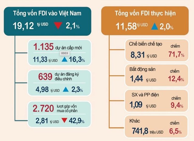 Trong đó, vốn đăng ký cấp mới có 1.135 dự án được cấp phép với số vốn đăng ký đạt 11,33 tỷ USD, giảm 36,8% về số dự án và tăng 16,3% về số vốn đăng ký so với cùng kỳ năm trước; vốn đăng ký điều chỉnh có 639 lượt dự án đã cấp phép từ các năm trước đăng ký điều chỉnh vốn đầu tư tăng thêm 4,98 tỷ USD, tăng 2,3%.