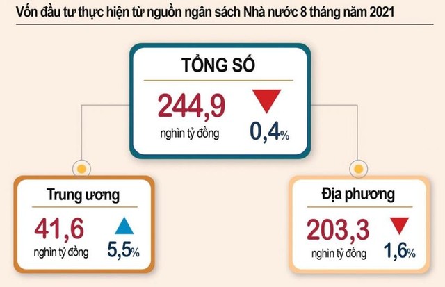 Tính chung 8 tháng năm 2021, vốn đầu tư thực hiện từ nguồn ngân sách nhà nước đạt 244.900 tỷ đồng, bằng 51,1% kế hoạch năm và giảm 0,4% so với cùng kỳ năm trước (cùng kỳ năm 2020 bằng 48% và tăng 28%), bao gồm vốn Trung ương quản lý đạt 41.600 tỷ đồng, bằng 49,6% kế hoạch năm và tăng 5,5% so với cùng kỳ năm trước; vốn địa phương quản lý đạt 203.300 tỷ đồng, bằng 51,5% kế hoạch năm và giảm 1,6%.