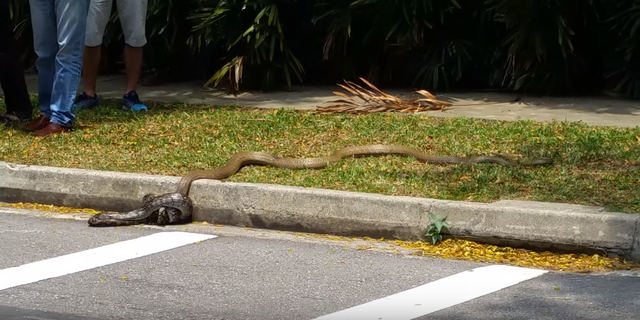 Điều bất ngờ, con trăn sau đó không hề bỏ đi mà nằm im tại chỗ, tỏ vẻ đờ đẫn, mệt mỏi, mặc kệ dòng xe cộ đông đúc qua lại. Dường như, nó đã bị con rắn cắn và chất độc bắt đầu ngấm vào người nên không còn khả năng di chuyển.