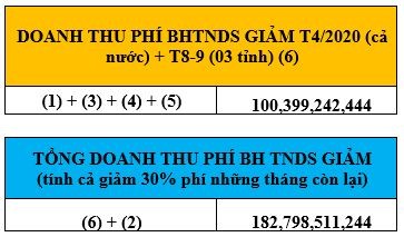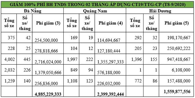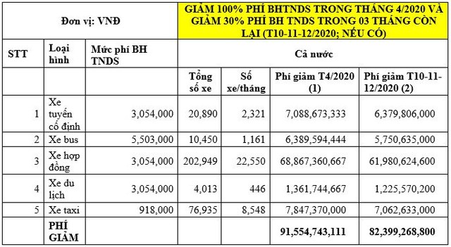 Đồng thời, với phương án giảm của Hiệp hội ô tô (như đề cập ở trên) thì theo ước tính của Công ty cổ phần Tư vấn dịch vụ bảo hiểm Việt Nam, tổng số tiền phí bảo hiểm trách nhiệm dân sự chủ xe ô tô mà các công ty bảo hiểm phải giảm sẽ dao động từ 100 tỷ đồng đến hơn 182 tỷ đồng tùy theo tình hình dịch bệnh, theo từng loài xe, tùy tỉnh bị dịch, số lượng xe cụ thể (xem bảng).
