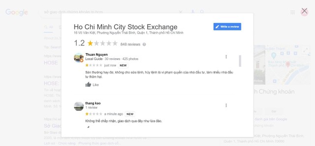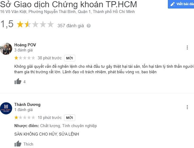 HOSE bị đánh giá 1.5 sao trên Google (hình ảnh chụp màn hình buổi sáng 9/6/2021) |