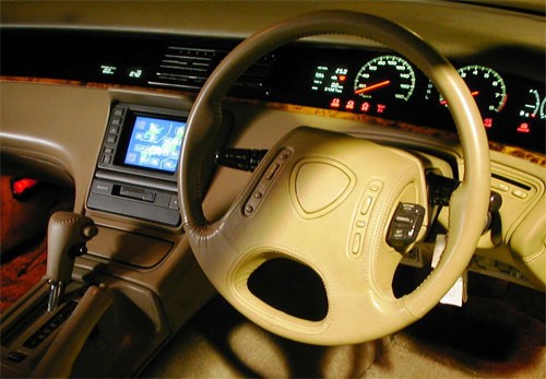 Màn hình cảm ứng ở bảng điều khiển trung tâm của Mazda Cosmo, hay Eunos Cosmo, hiển thị dữ liệu định vị vệ tinh.