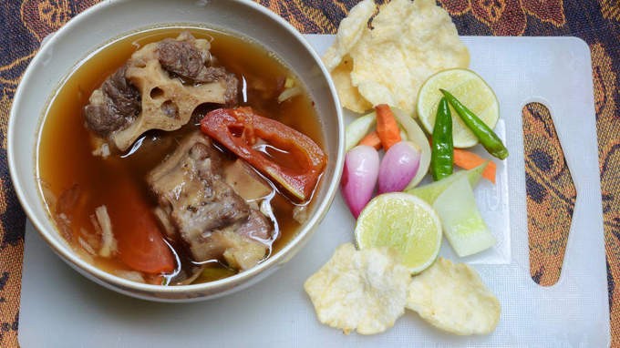 Sop buntut: Súp đuôi bò được đa số người dân ở quốc gia vạn đảo yêu thích. Món ăn được hồi sinh bởi một đầu bếp ở khách sạn Borabodor vào năm 1973. Ngày nay, người ta dùng thịt bò Australia nhập khẩu để làm phiên bản cao cấp. Món này được ăn kèm với cơm, dưa chua, chanh, hành tía, ớt, hành tây và cà rốt.