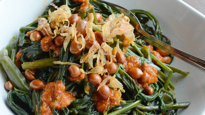 Kangkung được chế biến từ rau chân vịt xào cùng nước sốt đậu tương ngọt, tỏi, ớt, hành khô phi thơm. Địa chỉ bán món này ở số 36A đường Bendungan Hilir Raya, trung tâm Jakarta.