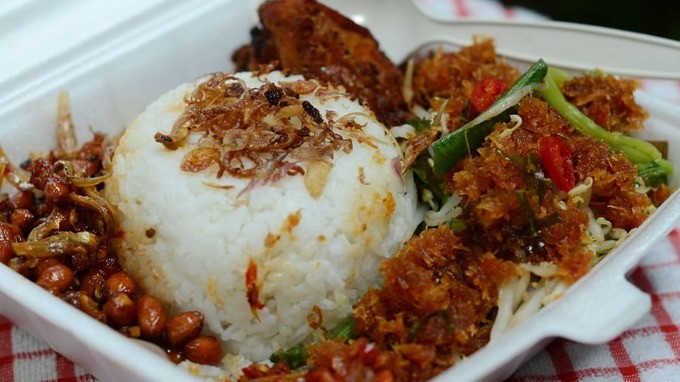 Nasi uduk là món ăn truyền thống được người dân địa phương yêu thích và lựa chọn cho bữa trưa. Cơm được nấu với nước cốt dừa, xung quanh là thịt, lạc rang, rau xào, cá cơm. Địa chỉ: Nasi Uduk Babe Saman, số 3, đường Kebon Kacang, thủ đô Jakarta. Quán ăn nằm gần chợ Gandaria Los Kolontong.