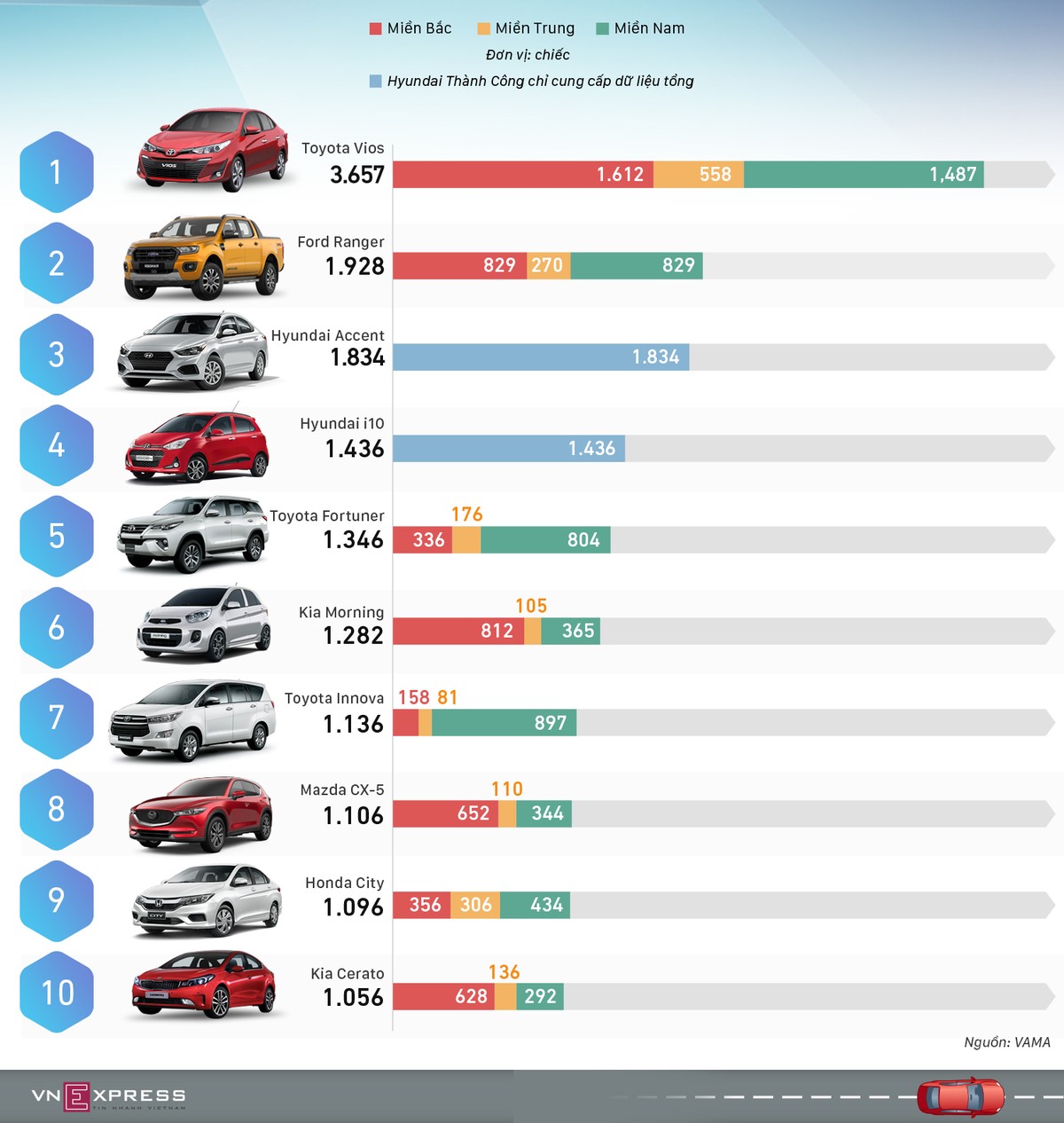 Vios, Ranger, Accent dẫn đầu danh sách, xe lắp ráp trong nước áp đảo nhập khẩu tại thị trường Việt Nam.