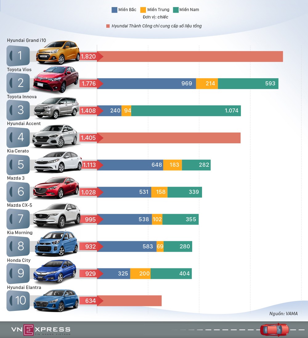 Hyundai i10, Accent, Toyota Vios, Innova, những cái tên quen thuộc dẫn đầu bảng xếp hạng hàng tháng.