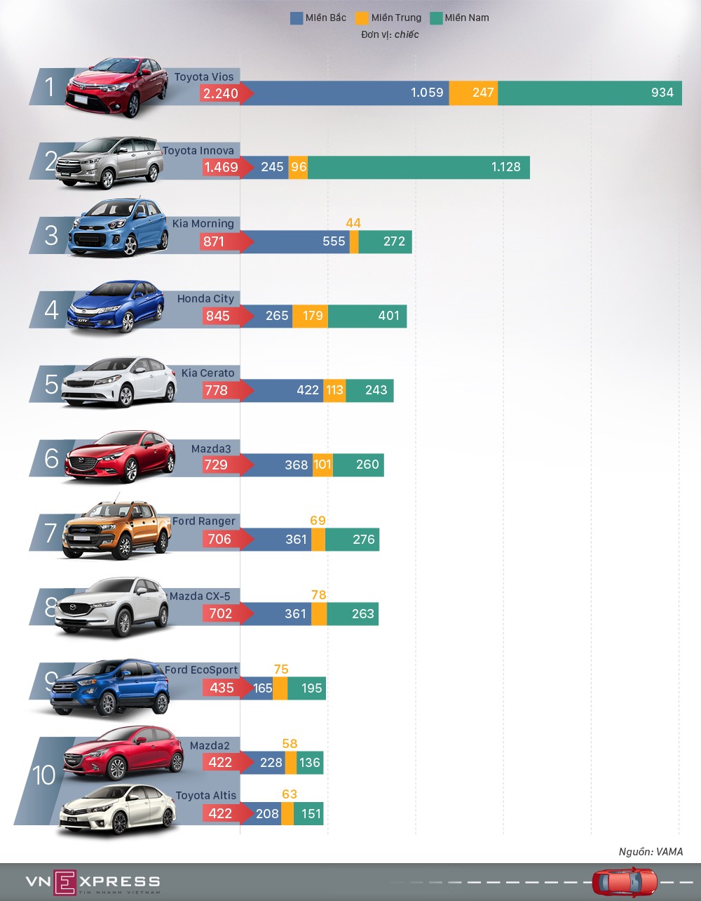 9 trong 10 mẫu xe bán chạy nhất tháng là xe lắp ráp, chỉ có Ranger nhập khẩu đứng ở vị trí thứ 7.
