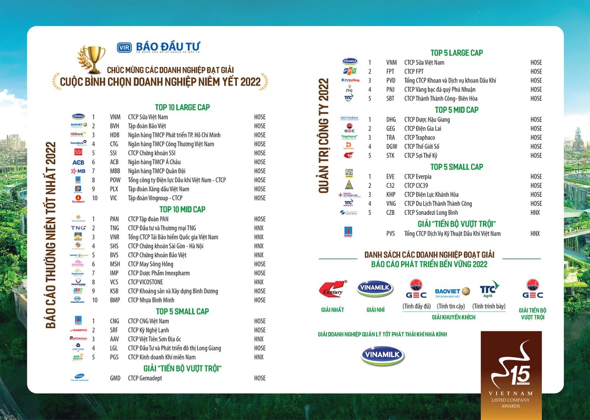 Bốn mươi doanh nghiệp niêm yết xuất sắc nhất trong minh bạch thông tin năm 2022 đã được vinh danh tại Lễ trao giải Cuộc bình chọn Doanh nghiệp niêm yết lần thứ 15- năm 2022 vừa diễn ra tại Trung tâm Hội nghị Ariyana - Furama Resort Danang.
