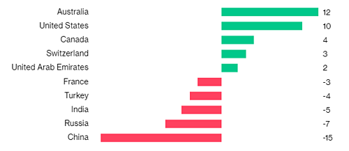 5 quốc gia có lượng triệu phú USD di cư đến (màu xanh) và đi (màu đỏ) nhiều nhất.Đơn vị: nghìn người.