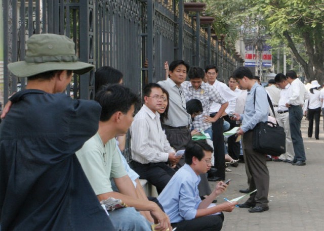 Nhà đầu tư chờ đấu giá cổ phiếu tại cổng Trung tâm Giao dịch chứng khoán TP.HCM