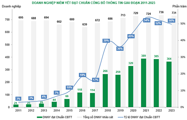 Tỷ lệ doanh nghiệp niêm yết đạt Chuẩn công bố thông tin có xu hướng tăng dần theo thời gian trong 13 năm qua (2011-2023). Ba năm gần nhất (2021-2023), tỷ lệ này duy trì ở vùng cao so với trước nhưng đã có xu hướng chững lại. Đây cũng là giai đoạn hoạt động của các doanh nghiệp nói chung và hoạt động công bố thông tin nói riêng có những ảnh hưởng từ đại dịch COVID-19 cũng như nhiều biến cố lớn trên thị trường chứng khoán.