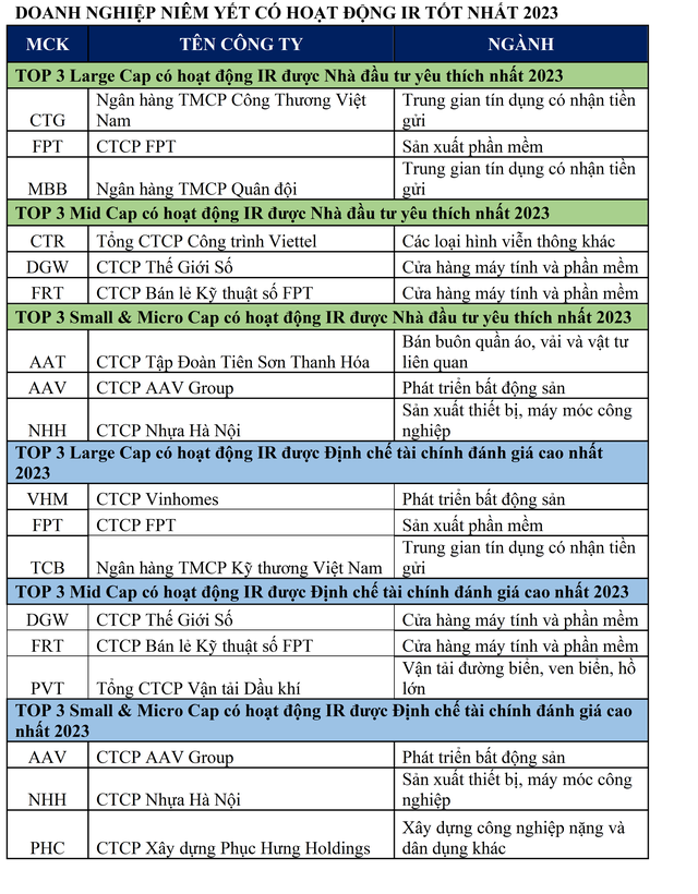 Những doanh nghiệp xuất sắc và dẫn đầu về hoạt động IR trong tổng số 731 doanh nghiệp niêm yết đã chính thức được công bố tại Lễ vinh danh IR Awards 2023 diễn ra sáng 28/09/2023. Các hạng mục được vinh danh bao gồm Top 3 Doanh nghiệp niêm yết có hoạt động IR được Nhà đầu tư yêu thích nhất 2023 và Top 3 Doanh nghiệp niêm yết có hoạt động IR được Định chế tài chính đánh giá cao nhất 2023 chia theo quy mô vốn hóa.