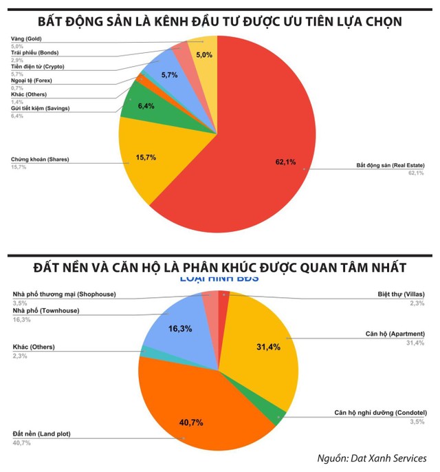 Cuộc khảo sát về danh mục đầu tư năm 2022 do Công ty cổ phần Tập đoàn Đất Xanh (Dat Xanh Services) thực hiện mới đây cho thấy, có đến 64% người được khảo sát lựa chọn bất động sản là loại tài sản ưu tiên đầu tư trong năm 2022; 14,7% người lựa chọn đầu tư vào chứng khoán; 7,3% lựa chọn tiền điện tử; 3,7% lựa chọn gửi tiết kiệm và mua vàng; các loại hình khác chiếm 1,8%.