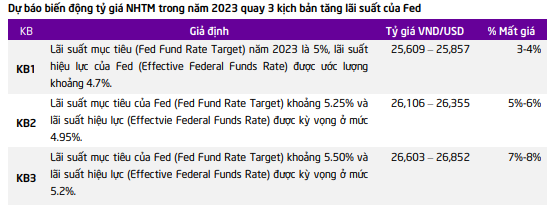 Theo dự đoán của TPS, lãi suất mục tiêu của Fed năm 2023 sẽ dao động từ mức 5 – 5,5%. Theo đó, nhóm phân tích đã đưa ra dự báo biến động tỷ giá Ngân hàng thương mại qua 3 kịch bản.
