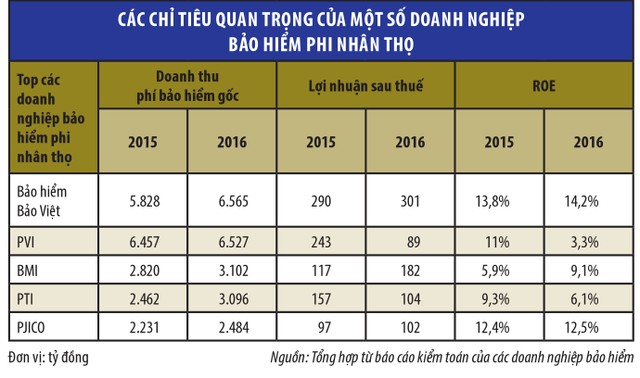 Như vậy, nếu xét về chỉ tiêu lợi nhuận, theo số liệu từ Hiệp hội Bảo hiểm Việt Nam, ước tính năm 2016, có 25/30 doanh nghiệp bảo hiểm phi nhân thọ lãi trước thuế. Tổng lợi nhuận kế toán trước thuế chung cuộc của các doanh nghiệp bảo hiểm phi nhân thọ năm 2016 đạt 1.405 tỷ đồng, giảm 1% so với năm 2015. Tỷ suất lợi nhuận kế toán trước thuế/vốn chủ sở hữu đạt 6% (năm 2015 là 6,5%). Trong đó, có 25/30 doanh nghiệp bảo hiểm phi nhân thọ và chi nhánh nước ngoài lãi trước thuế.