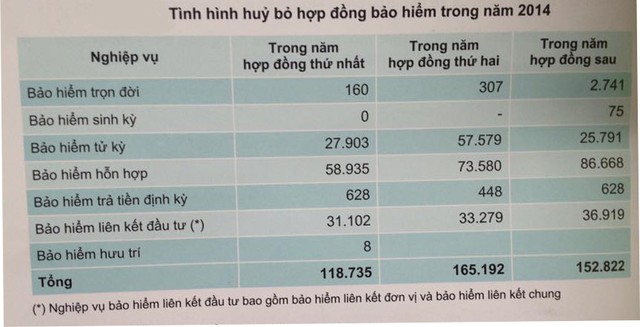 Trong đó, số hợp đồng bảo hiểm bị hủy bỏ năm thứ nhất là 118.735 hợp đồng, năm thứ 2 là 165.192 hợp đồng và các năm sau là 152.822 hợp đồng.
