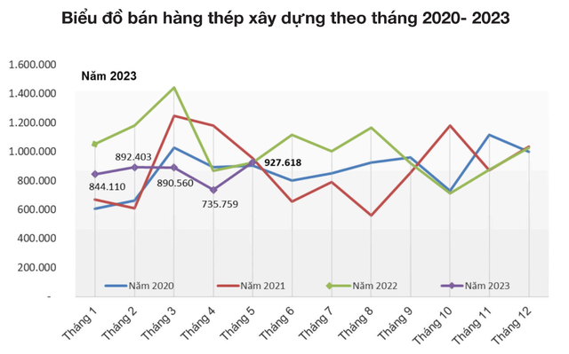 Tính chung 5 tháng đầu năm, sản xuất thép xây dựng đạt hơn 4,25 triệu tấn, giảm 26,3% so với cùng kỳ 2022; bán hàng đạt 4,29 triệu tấn, giảm 22,6%. Trong đó, xuất khẩu đạt 681.000 tấn, giảm 40,6% so với cùng kỳ.