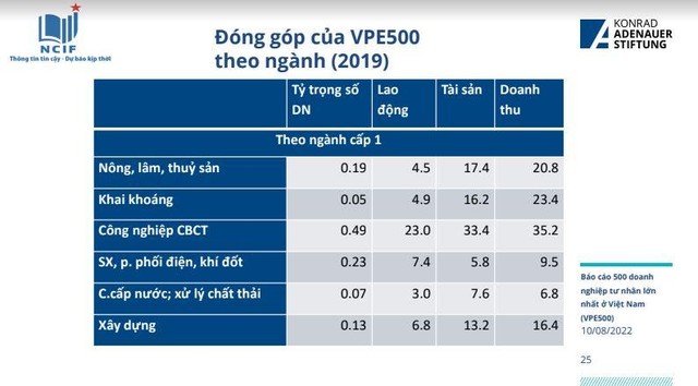Báo cáo phân tích về hoạt động của 500 doanh nghiệp tư nhân (VPE500), Tiến sỹ Trần Toàn Thắng, Trưởng Ban dự báo kinh tế ngành và doanh nghiệp NCIF cho biết, doanh nghiệp tư nhân trong nước đang ngày càng khẳng định vị trí quan trọng trong nền kinh tế. VBF 500 xuất hiện ở 57/63 tỉnh thành phố, đang hoạt động vượt trội so với doanh nghiệp tư nhân trong nước với quy mô lao động và tài sản bình quân cao hơn 83 lần và 132 lần doanh nghiệp tư nhân nói chung…