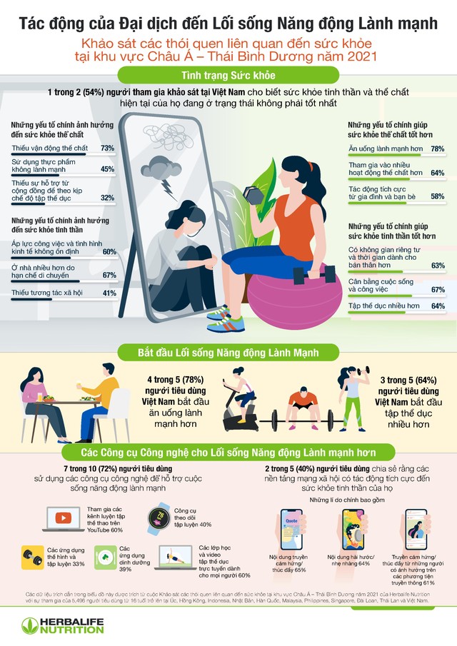 Bên cạnh đó, 7/10 (72%) người tiêu dùng hiện nay sử dụng các công cụ công nghệ, như các lớp học và video tập thể dục trực tuyến dành cho mọi người (60%), công cụ theo dõi tập luyện (40%), các ứng dụng thể hình và tập luyện (33%) và các ứng dụng dinh dưỡng (39%) để hỗ trợ chế độ sinh hoạt lành mạnh của mình….
