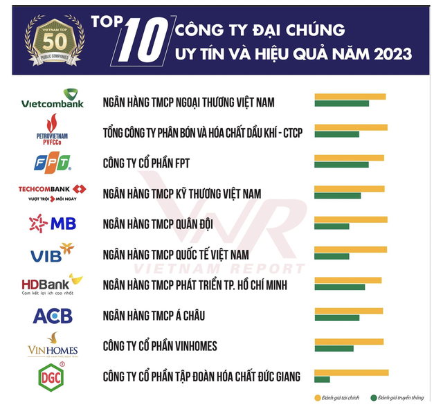 Trong báo cáo năm nay, Vietcombank, Techcombank, MB và VIB nằm trong Top 6 công ty đại chúng uy tín và hiệu quả năm 2023. Đây đều là những ngân hàng dẫn đầu toàn ngành về tăng trưởng lợi nhuận, khả năng sinh lời cũng như chất lượng tài sản.