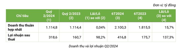 Theo BCTC quý II/2024 vừa công bố, Bamboo Capital ghi nhận 1.114,8 tỷ đồng doanh thu thuần, chỉ tăng 0,04% so với cùng kỳ năm 2023. Đóng góp về mặt doanh thu chủ yếu đến từ mảng Năng lượng tái tạo (369,4 tỷ đồng), chiếm 33,1%, Xây dựng hạ tầng (338,5 tỷ đồng), chiếm 30,4% và Dịch vụ tài chính (180,2 tỷ đồng), chiếm 16,2% tỷ trọng doanh thu của Tập đoàn. Đáng chú ý, lợi nhuận sau thuế quý II/2024 đạt 318,6 tỷ đồng, tăng mạnh 98,2% so với quý II/2023.