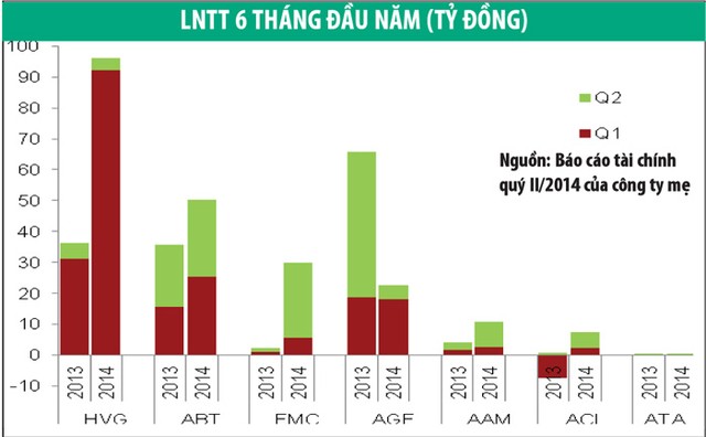 Lợi nhuận trước thuế của 7 doanh nghiệp này cũng giảm xấp xỉ 7%. Đáng chú ý, lợi nhuận quý II/2014 của công ty mẹ HVG chỉ chưa đầy 4 tỷ đồng, giảm 22,6% so với cùng kỳ và chưa bằng con số lẻ của quý I năm nay (hơn 96 tỷ đồng).