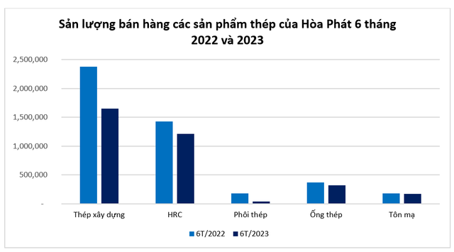 Lũy kế 6 tháng, Tập đoàn Hòa Phát sản xuất 2,86 triệu tấn thép thô, giảm 34% so với cùng kỳ năm trước. Sản lượng bán hàng thép xây dựng, phôi thép và HRC đạt 2,9 triệu tấn, giảm 27% so với 6 tháng đầu năm 2022.