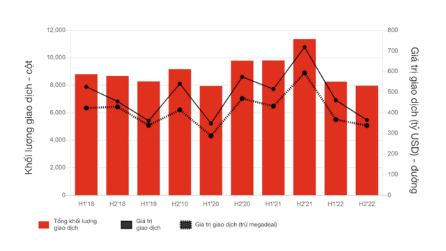 Sau khi ghi nhận số giao dịch ở mức cao kỷ lục (65.000 giao dịch) vào năm 2021, thị trường M&A toàn cầu đối mặt nhiều thách thức trong năm 2022, với khối lượng giao dịch giảm 17% và giá trị thương vụ giảm 37%. Tuy nhiên, vẫn duy trì cao hơn năm 2020 và mức trước đại dịch.