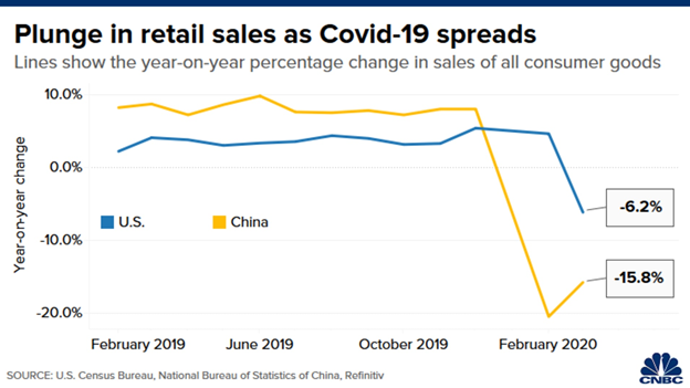 Cả Mỹ và Trung Quốc đều báo cáo số liệu sụt giảm mạnh trong doanh số bán lẻ vì các biện pháp phong tỏa trong thời kỳ đại dịch khiến các cửa hàng phải đóng cửa và người tiêu dùng phải ở nhà. Mặt khác, sự gia tăng doanh số bán hàng trực tuyến bởi các nhà bán lẻ như Amazon không đại diện cho tổng thể sụt giảm cuả ngành, theo các nhà phân tích từ Oxford Economics.
