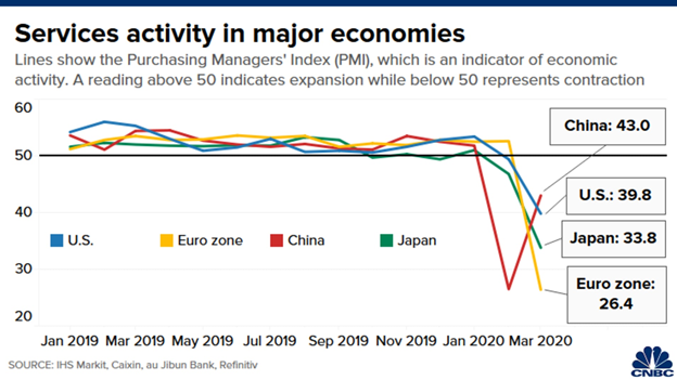 "Quỹ Tiền tệ Quốc tế (IMF) dự báo kinh tế toàn cầu có thể giảm 3% trong năm nay, chỉ có số ít các quốc gia như Trung Quốc và Ấn Độ là tăng trưởng dương trong năm 2020”, IMF cho biết.