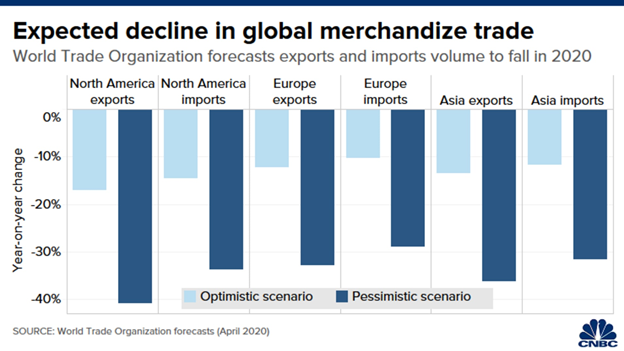 Tổ chức thương mại thế giới (WTO) trong dự báo mới nhất trong tháng này nhận định khối lượng thương mại toàn cầu có thể giảm mạnh 12,9 - 31,9% trong năm nay, điều này phụ thuộc vào quỹ đạo của nền kinh tế toàn cầu.