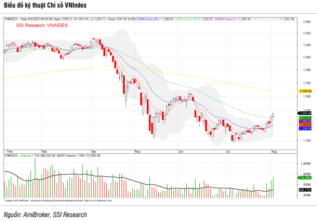 Đầu tiên, thị trường chậm lại đà giảm kiểm định lại vùng đáy ngắn hạn 1.150 điểm trên VN-Index và nỗ lực hồi phục trong phần lớn thời gian của của tháng 7. Diễn biến này tiếp tục vào những phiên đầu tháng 8, cụ thể chỉ số VN-Index đã lần lượt chinh phục thành công kháng cự quan trọng 1.200 điểm và 1.220 điểm trong phiên ngày 01/08.