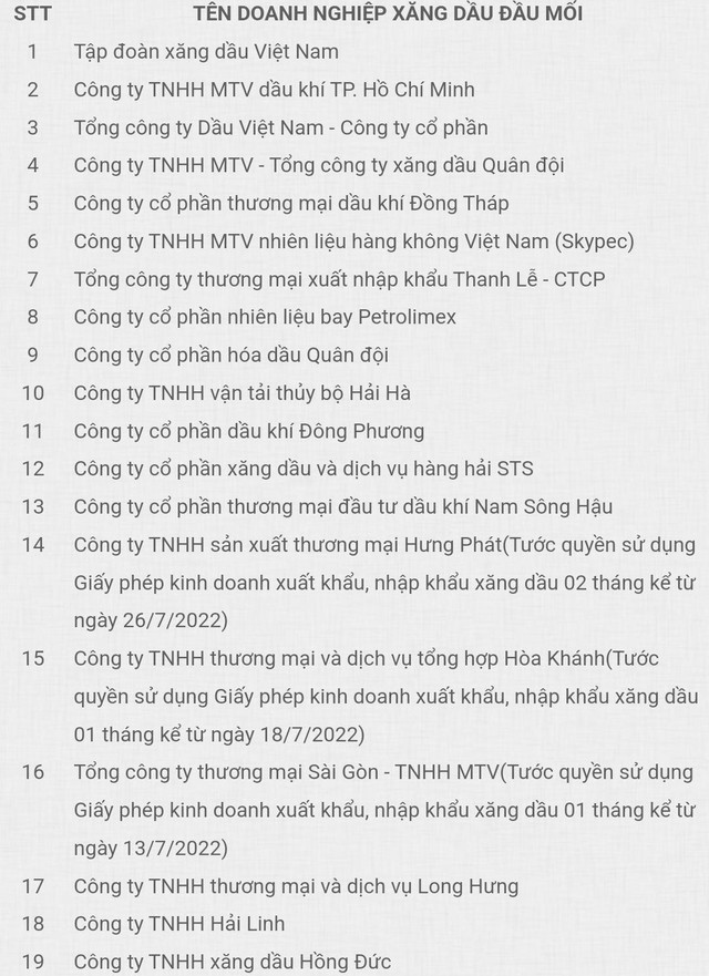 Công ty cổ phần nhiên liệu Phúc Lâm (tước quyền sử dụng Giấy phép kinh doanh xuất khẩu, nhập khẩu xăng dầu 1 tháng kể từ ngày 19.7.2022).