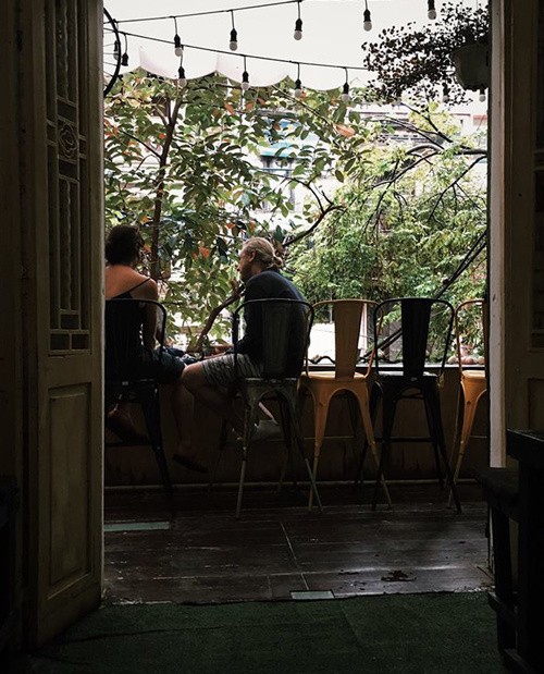 Nằm sâu trong một con hẻm ở phố cổ, không gian quán gói gọn ở tầng 2. Quán có cả ở ngoài trời lẫn trong nhà nhưng mọi người thường ngồi ngoài trời nhiều hơn. Ở ngoài ban công, bạn có thể ngắm nhìn đường phố và thưởng thức những bản nhạc du dương. Đồ uống ở đây khá rẻ, chủ yếu là món ăn và các loại trà. Ảnh: Nam Trần.