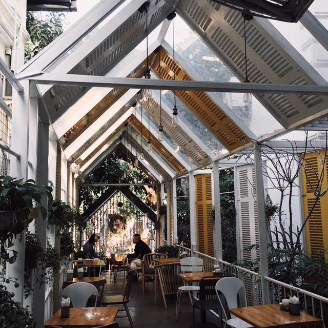 Culaccino là quán cà phê sân vườn nằm trong khuôn viên công viên Trần Quang Diệu, Đống Đa. Ấn tượng ban đầu là cả một ngôi nhà kính rộng, mái chóp tam giác hiện lên giữa khung cảnh xanh tươi của cây cối xen lẫn những bàn ghế gỗ để thư giãn. Lối đi được rải sỏi xen lẫn đá mảng theo từng bước tạo cảm giác hoà mình với thiên nhiên. Phía sau là không gian xanh tươi rợp bóng cây với điểm nhấn là cây hoa giấy ở tầng 2 và cây xoài to phía sau vườn. Đồ uống ở đây chủ yếu là cà phê và nước ép hoa quả. Ảnh: tripadvisor.
