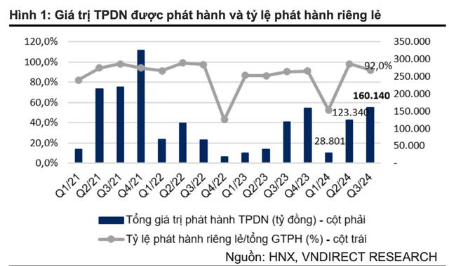 Theo số liệu tổng hợp của VNDirect, trong quý III/2024 có 157 đợt phát hành trái phiếu doanh nghiệp trong nước thành công với tổng giá trị phát hành đạt khoảng 160.140 tỷ đồng, tăng 29,8% so với quý II/2024 và cao hơn 33,9% so với cùng kỳ. Trong đó, có 153 đợt phát hành riêng lẻ với tổng giá trị phát hành đạt 147.276 tỷ đồng, chiếm 92% tổng giá trị phát hành; và 4 đợt phát hành ra công chúng với giá trị phát hành đạt 12.864 tỷ đồng, chiếm 8% tổng giá trị phát hành.