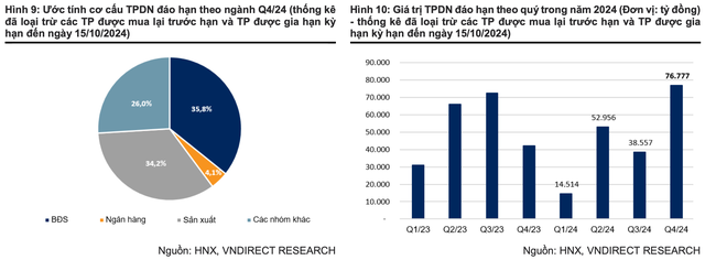 Sau khi hạ nhiệt nhẹ trong quý III/2024, VNDirect nhận thấy áp lực đáo hạn sẽ tăng mạnh trở lại trong quý IV/2024 với ước tính khoảng hơn 76.700 tỷ đồng trái phiếu doanh nghiệp riêng lẻ đáo hạn, tăng 99,1% so với quý III/2024.