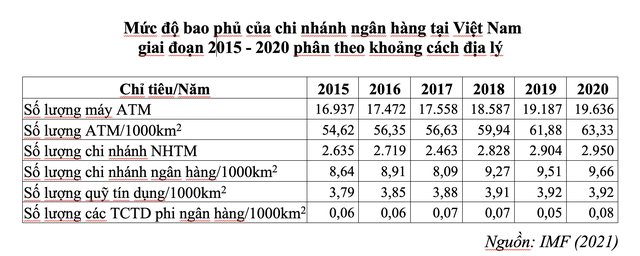 Số liệu IMF thống kê cho thấy sự phân bổ của các TCTD xét theo vị trí địa lý. Giai đoạn 2015 - 2020, đã có sự cải thiện về phương diện phân bố của hệ thống ATM, các chi nhánh NHTM, các quỹ tín dụng và các TCTD phi ngân hàng.