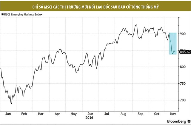 Tài sản của các thị trường mới nổi đã theo hướng lao dốc kể từ khi kết quả bầu cử được công bố, khi đồng USD mạnh và mức lãi suất được nâng lên kéo dòng tiền quay trở lại nước Mỹ và các mối nguy cơ tiềm ẩn từ đường lối bảo hộ nền kinh tế nội địa của tổng thống mới sẽ đe dọa đà tăng trưởng của khu vực này.
