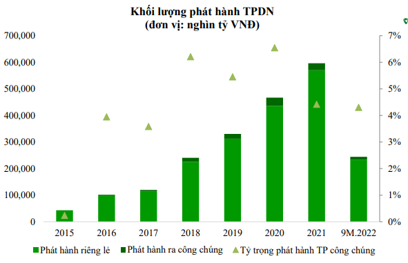 Trong 9 tháng 2022, có 411 đợt phát hành trái phiếu doanh nghiệp trong nước với tổng giá trị phát hành đạt 244.191 tỷ đồng (giảm 67,78% so với cùng kỳ năm ngoái). Trong đó: 389 đợt phát hành riêng lẻ với tổng giá trị là 233.692 tỷ đồng tiếp tục là hình thức chủ đạo (95,7%); 22 đợt phát hành ra công chúng giá trị 10.498 tỷ đồng (chiếm 4,3% tổng giá trị phát hành). Ngoài ra, có 2 đợt phát hành trái phiếu ra thị trường quốc tế giá trị 625 triệu USD: của Tập đoàn Vingroup.